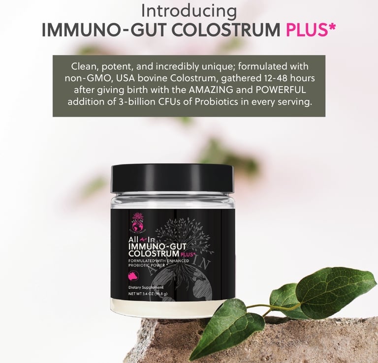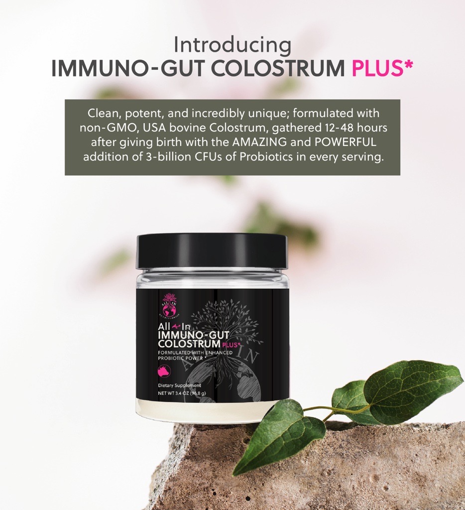 Clean, potent, and incredibly unique; All-In's Immuno-Gut Colostrum Plus*™ is formulated with non-GMO, USA bovine Colostrum, gathered 12-48 hours after giving birth with the AMAZING and POWERFUL addition of 3-billion colony forming units (CFUs) of Probiotics in every serving.